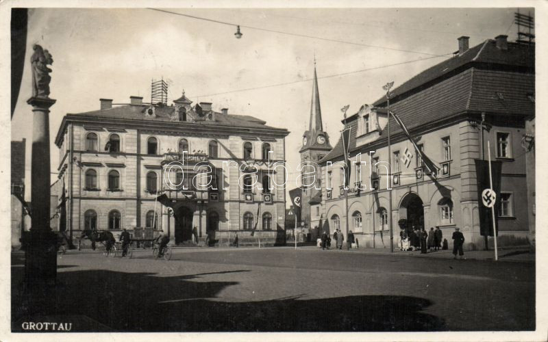 Hradek nad Nisou (Grottau) square with NS decoration https://www.darabanth.com/hu/138-Gyorsarveres/138.0/Kepeslapok/Cseh-Koztarsasag~400048/Hradek-nad-Nisou-Grottau-square-with-NS-decoration~II403622