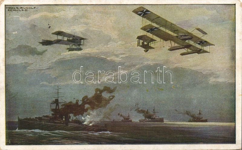 German aeroplanes above English warships s: Hans Rudolf Schulze https://www.darabanth.com/hu/138-Gyorsarveres/138.0/Kepeslapok/Katonai-Repulo~400092/German-aeroplanes-above-English-warships-s-Hans-Rudolf-Schulze~II402266