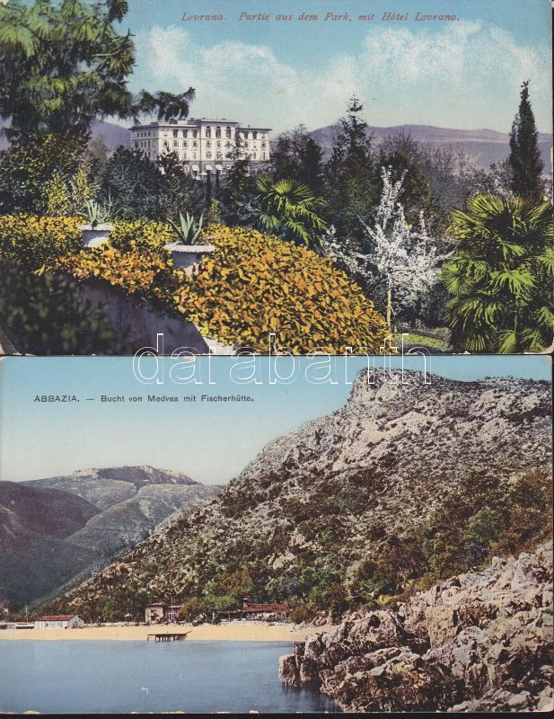 Leírás: Lovrana és Abbazia 2 db képeslap 1913-ból