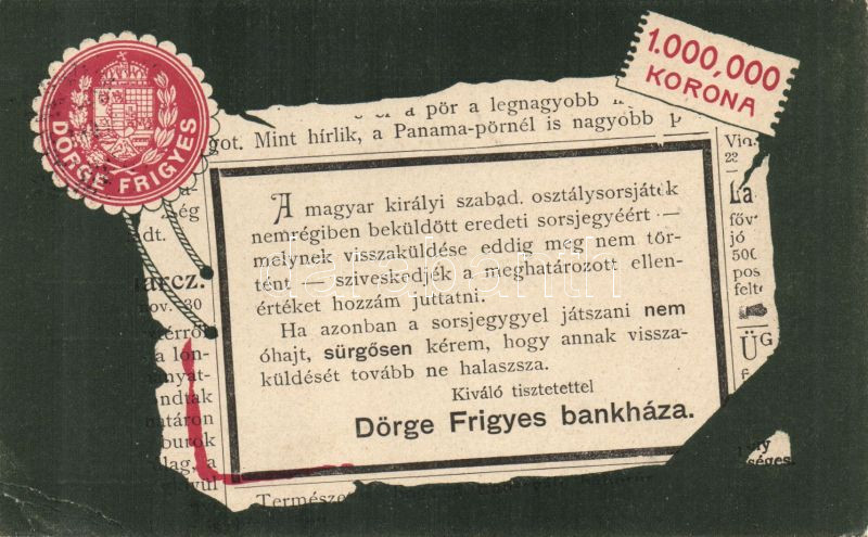Dörge Frigyes bank lottery (EB) https://www.darabanth.com/hu/138-Gyorsarveres/138.0/Kepeslapok/Reklam~400098/Dorge-Frigyes-bank-lottery-EB~II401705