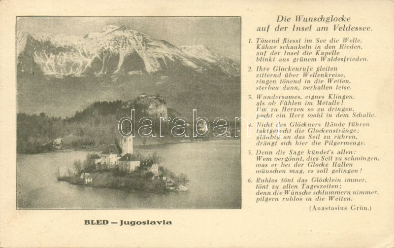 Bled (Veldes) church, poem https://www.darabanth.com/hu/138-Gyorsarveres/138.0/Kepeslapok/Szlovenia~400074/Bled-Veldes-church-poem~II402710