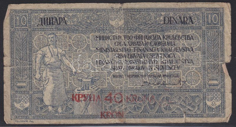 Jugoszlávia 1919. 10D 40K fölülnyomással T:IV https://www.darabanth.com/hu/138-Gyorsarveres/138.0/Numizmatika/Kulfoldi-bankjegyek~400120/Jugoszlavia-1919-10D-40K-folulnyomassal-TIV~II403199