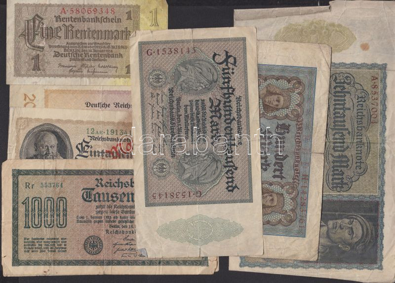 Leírás: Német Birodalom/Weimari Köztársaság 1920. 100M + 1922. 1000M (2x) + 1000M "Eine Milliarde Mark" felülnyomással + 10.000M + 1923. 500.000M + 200.000.000M + 1937. 1RM T:III,IV
