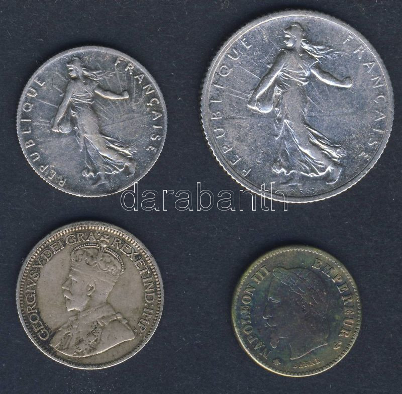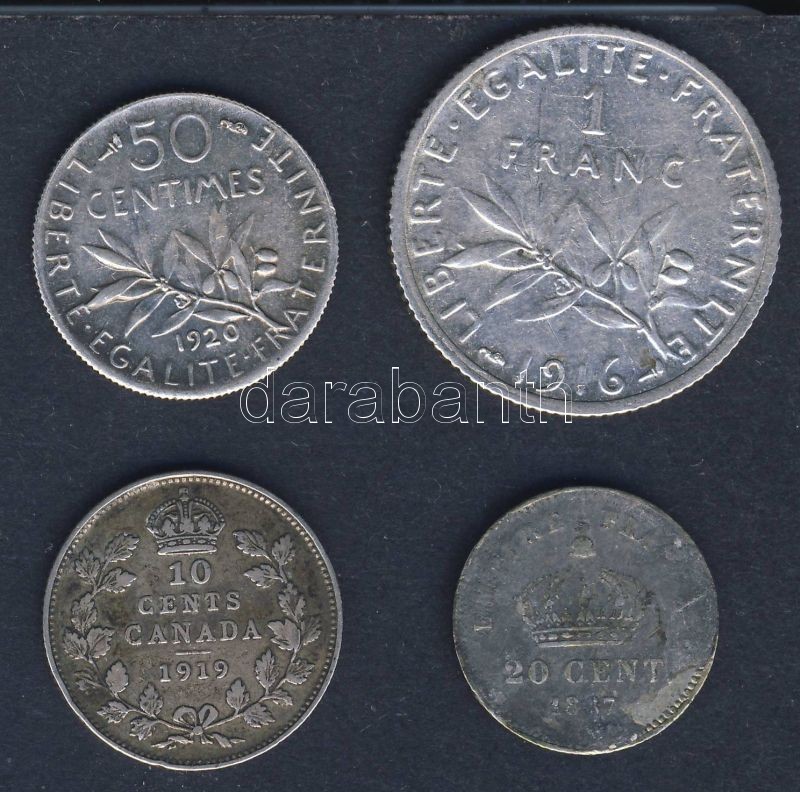 Leírás: Kis ezüst tétel: Franciaország 1916. 1Fr Ag + 1920. 50c Ag + Kanada 1919. 10c Ag + Franciaország 1867. 20c Ag "III. Napoleon" T:2-,3