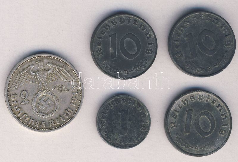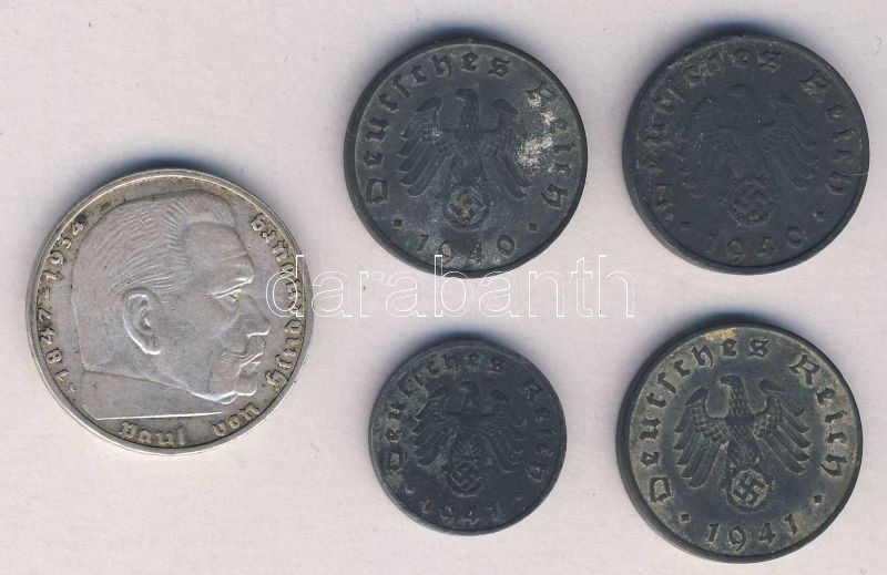 Leírás: Német 3. Birodalom 1939. 2M "Hindenburg" Ag + 1940A,B-41A. 1Pf + 10Pf (3x) T:2-,3