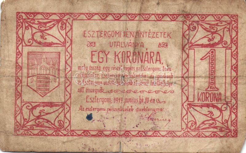 Esztergom 1919. 1K T:IV elcsúszott hátlapi nyomattal https://www.darabanth.com/hu/138-Gyorsarveres/138.0/Numizmatika/Magyar-es-kulfoldi-papir-es-fem-szuksegpenzek-penzhelyettesitok-~400115/Esztergom-1919-1K-TIV-elcsuszott-hatlapi-nyomattal~II401854