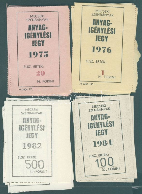 "Mecseki Szénbányák" anyagigénylési jegyek: 1975. 1M Ft, 5M Ft, 10M Ft, 20M Ft + 1976. 1M Ft, 2M Ft, 5M Ft, 50M Ft, 100M Ft + 1981. 1,2,5,10,20,50,100,500E Ft + 1982. 1,2,5,10,20,50,100,500E Ft T:I