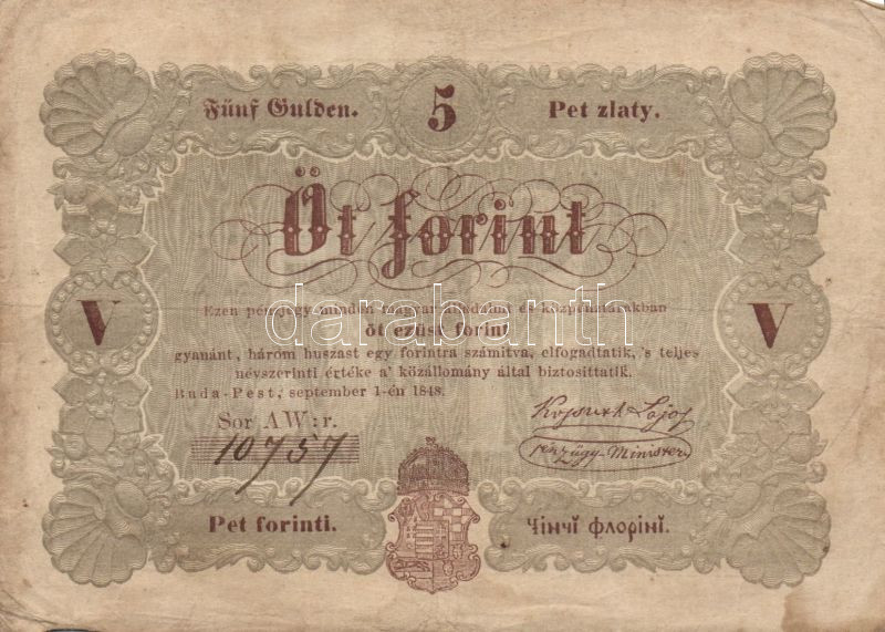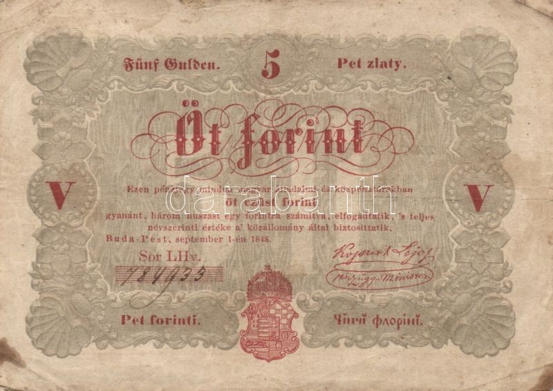 1848. 5Ft "Kossuth bankó" (2x) barna és piros T:III- https://www.darabanth.com/hu/138-Gyorsarveres/138.0/Numizmatika/Magyar-es-magyar-vonatkozasu-bankjegyek~400116/1848-5Ft-Kossuth-banko-2x-barna-es-piros-TIII-~II401866