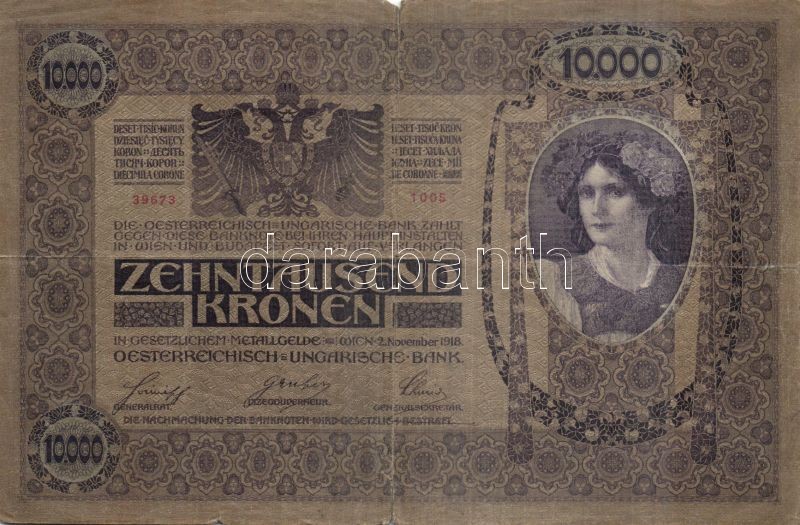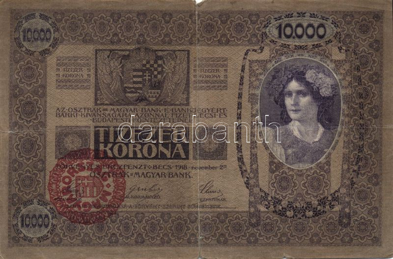 1918. 10000K piros "Magyarország" körbélyegzővel T:IV https://www.darabanth.com/hu/138-Gyorsarveres/138.0/Numizmatika/Magyar-es-magyar-vonatkozasu-bankjegyek~400116/1918-10000K-piros-Magyarorszag-korbelyegzovel-TIV~II402776