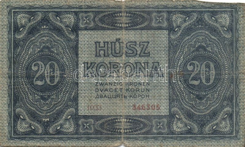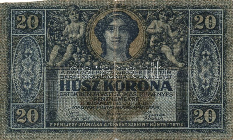 1919. július 15. 20K T:IV https://www.darabanth.com/hu/138-Gyorsarveres/138.0/Numizmatika/Magyar-es-magyar-vonatkozasu-bankjegyek~400116/1919-julius-15-20K-TIV~II401906