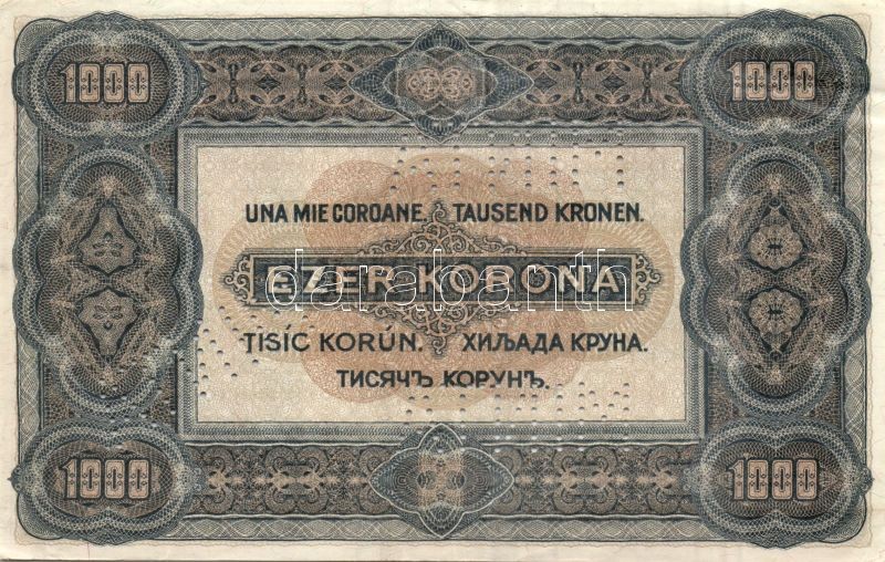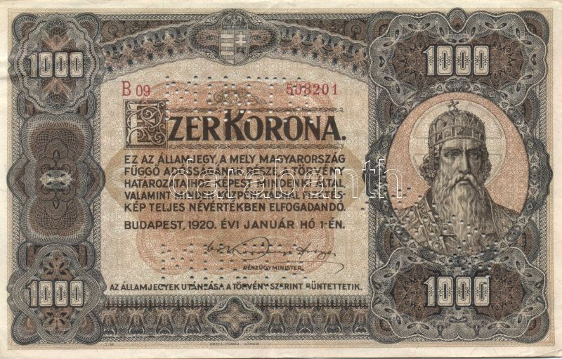 1920. 1000K "MINTA" perforációkkal, "B09-508201" sorszámmal T:II- (8-1... https://www.darabanth.com/hu/138-Gyorsarveres/138.0/Numizmatika/Magyar-es-magyar-vonatkozasu-bankjegyek~400116/1920-1000K-MINTA-perforaciokkal-B09-508201-sorszammal-TII-8-10-apro-lyukadas~II398072