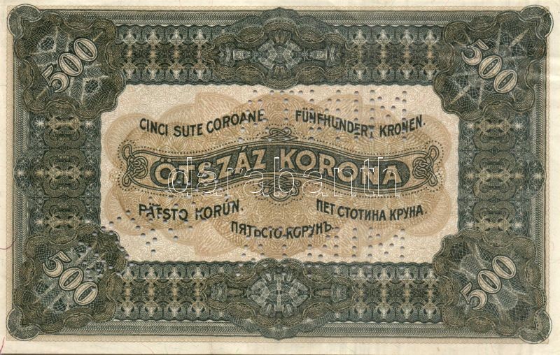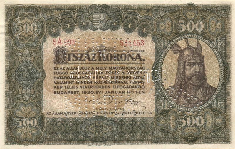 Leírás: 1920. 500K "MINTA" perforációkkal, "5A 003-541453" sorszámmal T:II (8-10 apró lyukadás!)