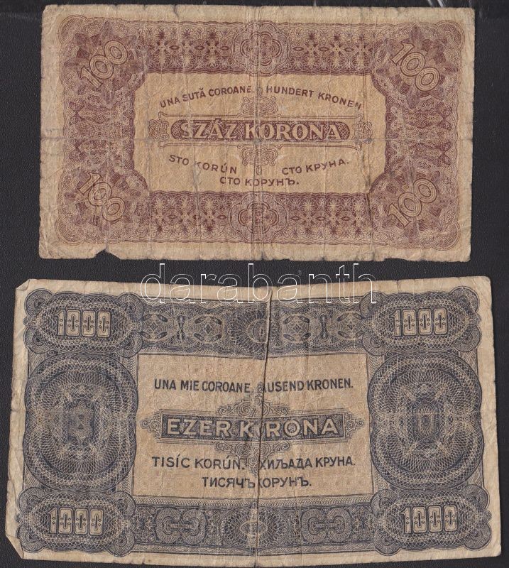 Leírás: 1923. 100K "0.8 FILLÉR NÉGYÖTÖD FILLÉR" felülbélyegzéssel + 1000K T.W. nyomdahely jelölés nélkül T:IV