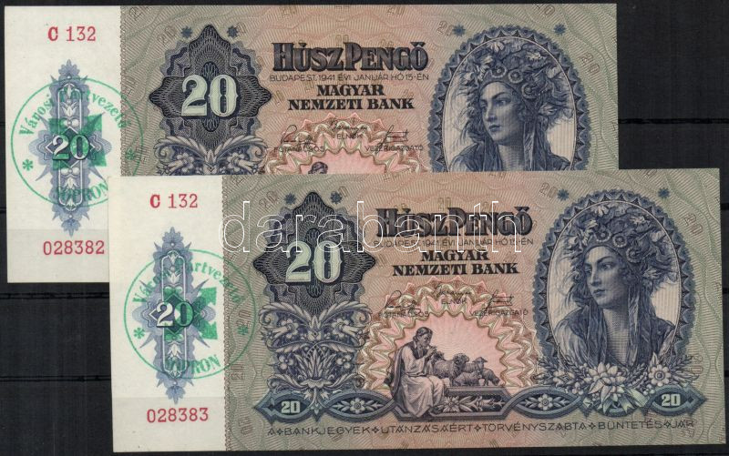 1941. 20P (2x) egymásutáni sorszámmal, "Városi Pártvezető SOPRON" zöld... https://www.darabanth.com/hu/138-Gyorsarveres/138.0/Numizmatika/Magyar-es-magyar-vonatkozasu-bankjegyek~400116/1941-20P-2x-egymasutani-sorszammal-Varosi-Partvezeto-SOPRON-zold-belyegzessel-TI~II357617
