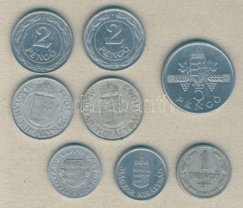 Leírás: 1941-46. 1P (2x) + 2P (4x) + 5P + 1Ft "Kossuth címer" T:2,3 ph.