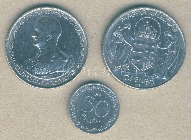 1943. 5P "Horthy balra" (2x) + 1953. 50f T:2+,2, https://www.darabanth.com/hu/138-Gyorsarveres/138.0/Numizmatika/Magyar-fem-es-ezustpenzek~400117/1943-5P-Horthy-balra-2x-plus-1953-50f-T2plus-2-~II399170