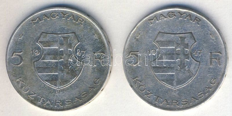 Leírás: 1947. 5Ft Ag (2x) "Kossuth" T:3 ph.
