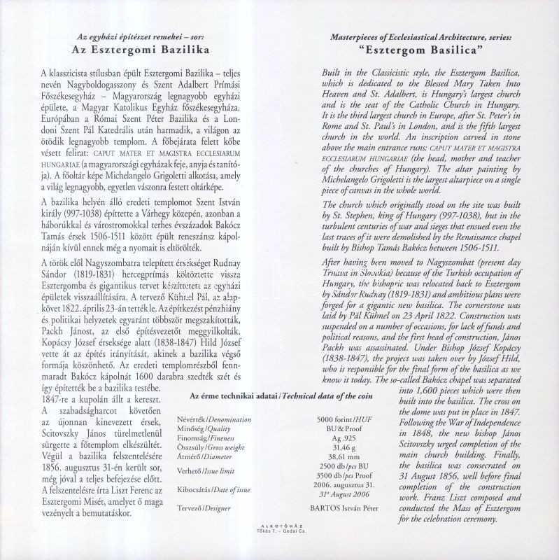 Leírás: 2006. 5000Ft Ag "Esztergomi Bazilika" T:PP Tanúsítvánnyal, csak 3500 db!