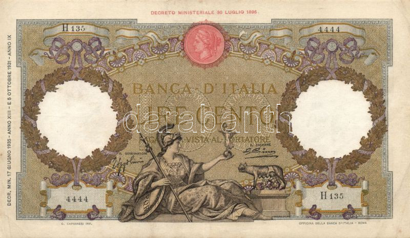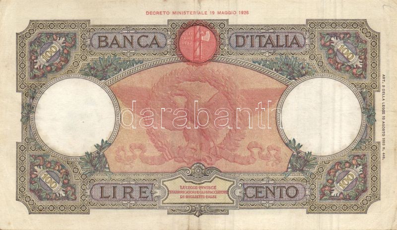 Olaszország 1931-36. 100L T:II- https://www.darabanth.com/hu/139-Gyorsarveres/139.0/Numizmatika/Kulfoldi-bankjegyek~10012/Olaszorszag-1931-36-100L-TII-~II403968
