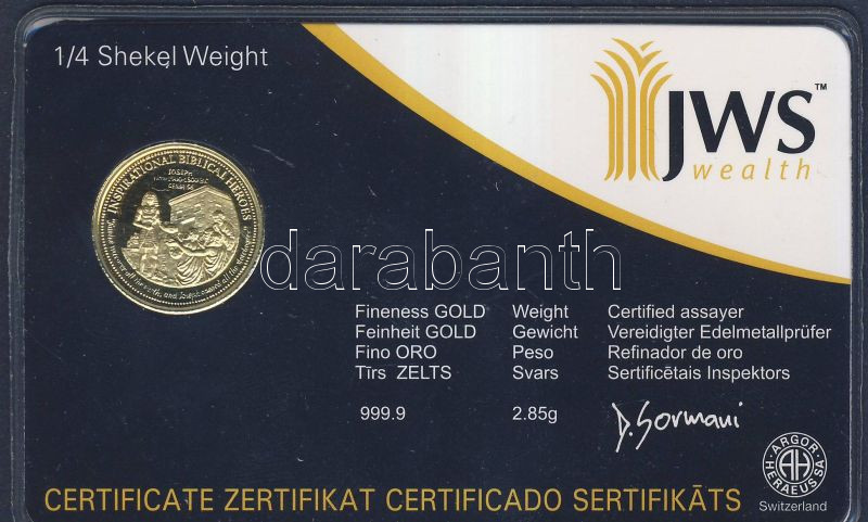 Leírás: Svájc 1/4 Shekel "JWS Wealth" arany érme Au (999.9) 2.85g T:PP eredeti bontatlan dísztokban és tanúsítvánnyal!