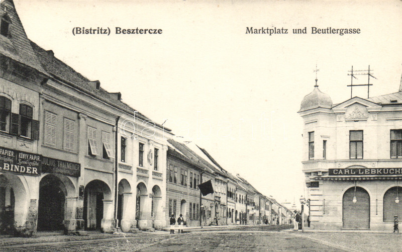 Beszterce market place, the shops of Carl Lebküchner and Julius Thealm... https://www.darabanth.com/hu/14-Nagyaukcio/14.1/Magyar-kepeslapok/Erdely~4344/Beszterce-market-place-the-shops-of-Carl-Lebkuchner-and-Julius-Thealmeiner~II540655