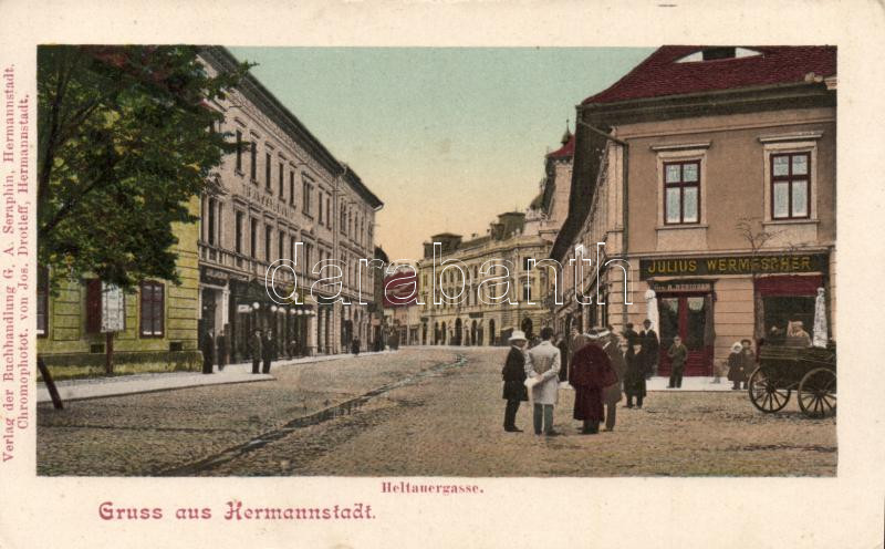 Leírás: Nagyszeben Heltau street, Hotel Transylvania and the shop of Julius Wermescher