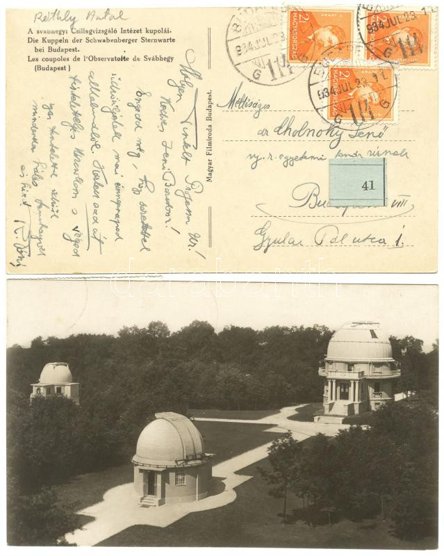 Leírás: 1934 Réthly Antal meteorológus, egyetemi tanár saját kézzel írt, Svábhegyi csillagvizsgálót ábrázoló képeslapja Cholnoky Jenő földrajztudósnak