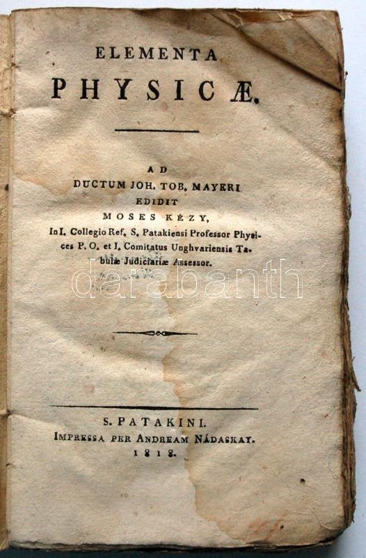 Kézy Mózes: Elementa physicae...S. Patakini 1818 Nádaskay András 500p. + 3 kihajtható tábla. Utolsó lapokon egérrégta / with 3 graphic tables. On the last few pages damages