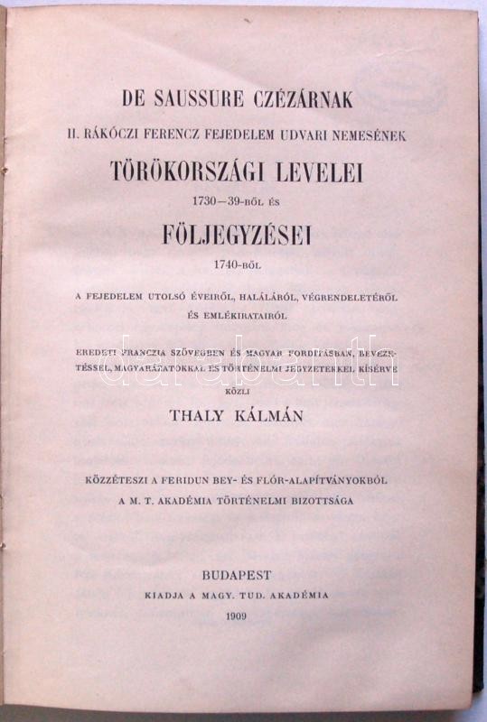 Thaly Kálmán: Saussure, Czézár de, II. Rákóczi Ferencz fejedelem udvari nemesének törökországi levelei 1730-39-ből és följegyzései 1740-ből a fejedelem utolsó éveiről, haláláról, végrendeletéről és emlékiratairól. Bp. 1909. MTA. Korabeli félvászon kötésben.
