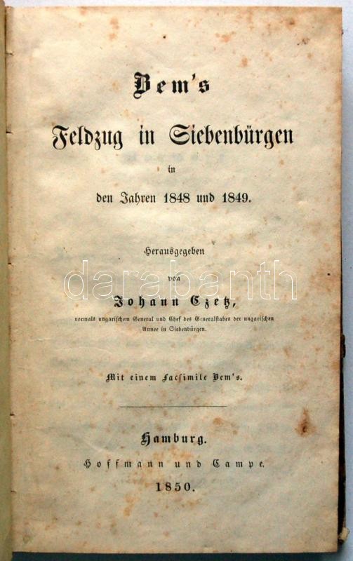 Czetz (János) Johann: Bem’s Feldzug in Siebenbürgen in den Jahren 1848 und 1849. Herausgegeben von- Hamburg, 1850. Hoffmann und Campe. Korabeli papírkötésben / in paper-binding 388p.