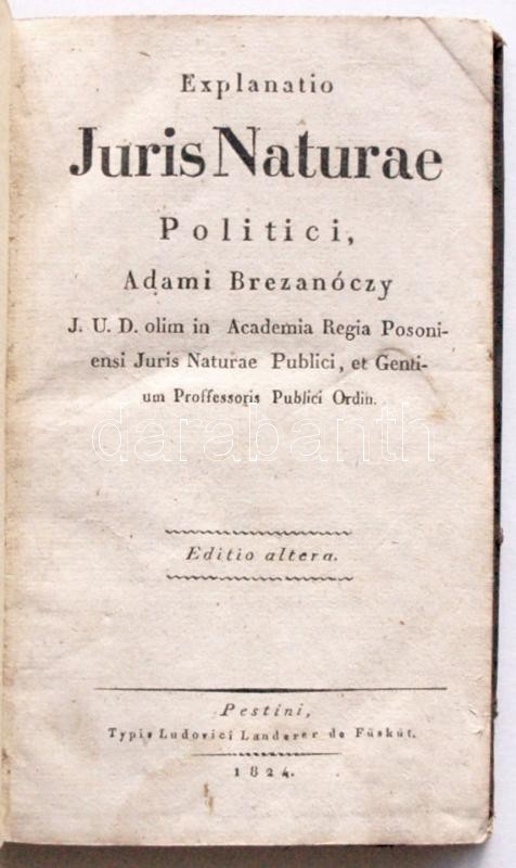 Brezanóczy, Adamii: Explanatio juris naturae politici. Pest 1824. Ludovici Landerer. 278p. korabeli kopott egészvászon kötésben. / In full linen binding