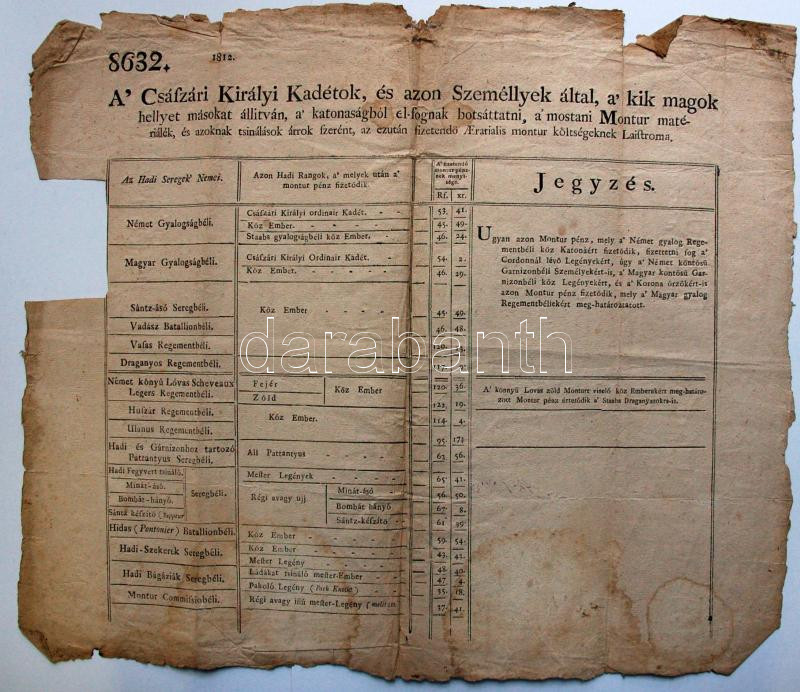 1812 Montur - katonaság megváltási díjtáblázat magyar nyelven. (sérült... https://www.darabanth.com/hu/14-Nagyaukcio/14.1/Mutargy-papirregiseg/Militaria~4101/1812-Montur--katonasag-megvaltasi-dijtablazat-magyar-nyelven-serult-3Cbr3E1812-Montur-Fee~II538060