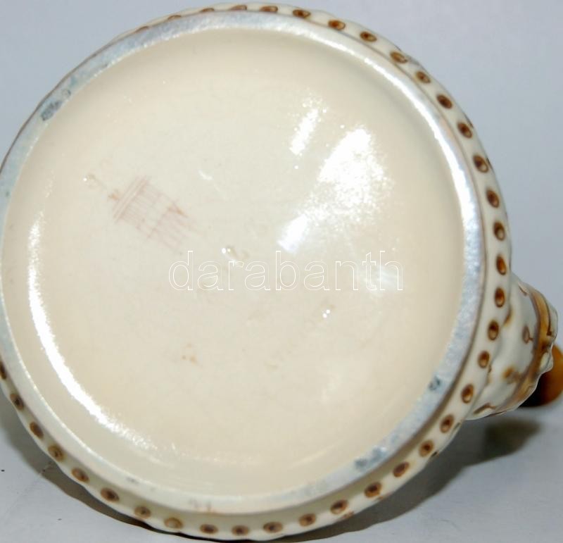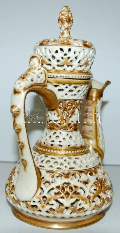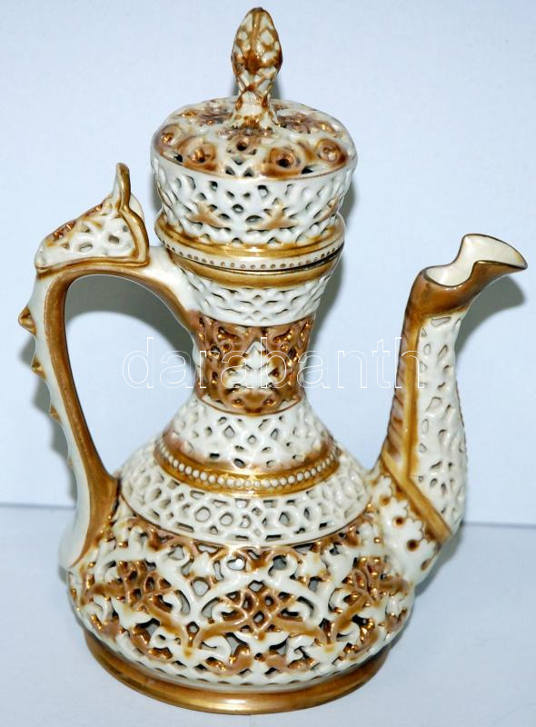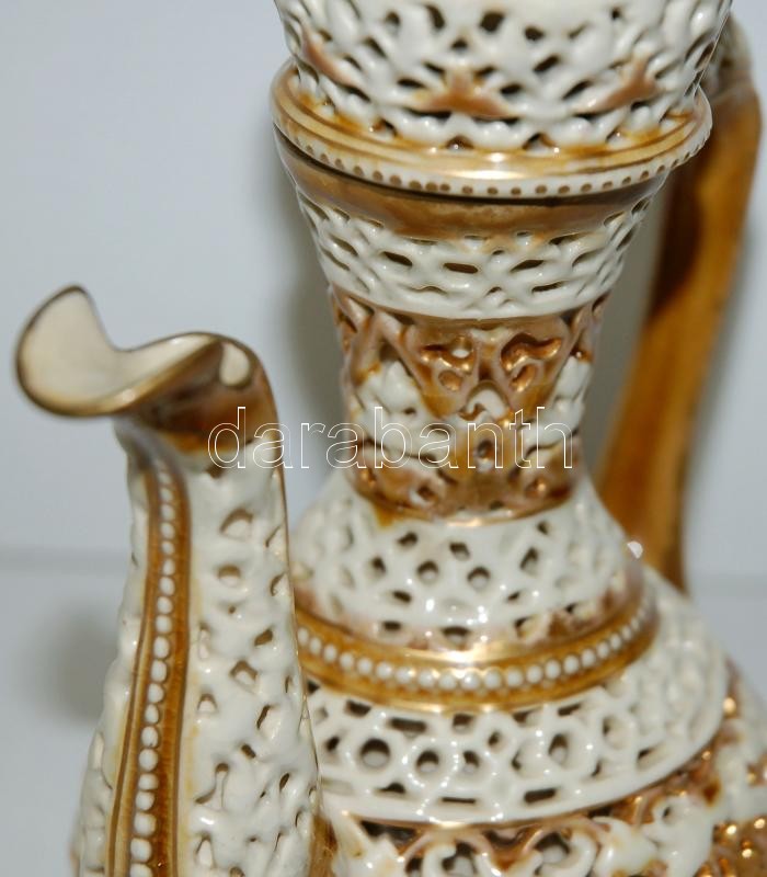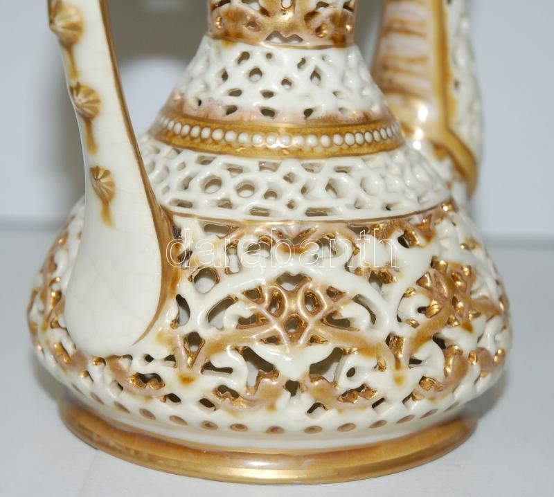 1800-as évek vége: Kézzel festett török díszítésű Zsolnay duplafalú áttört fajansz váza benyomott Zsolnay Pécs 2792 és kézzel rajzolt öttemplom jelzéssel, apró sérülések /