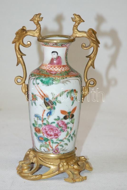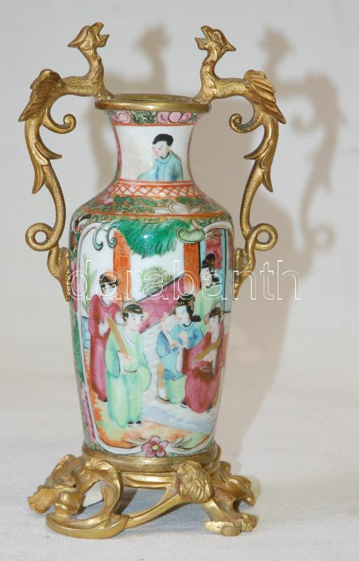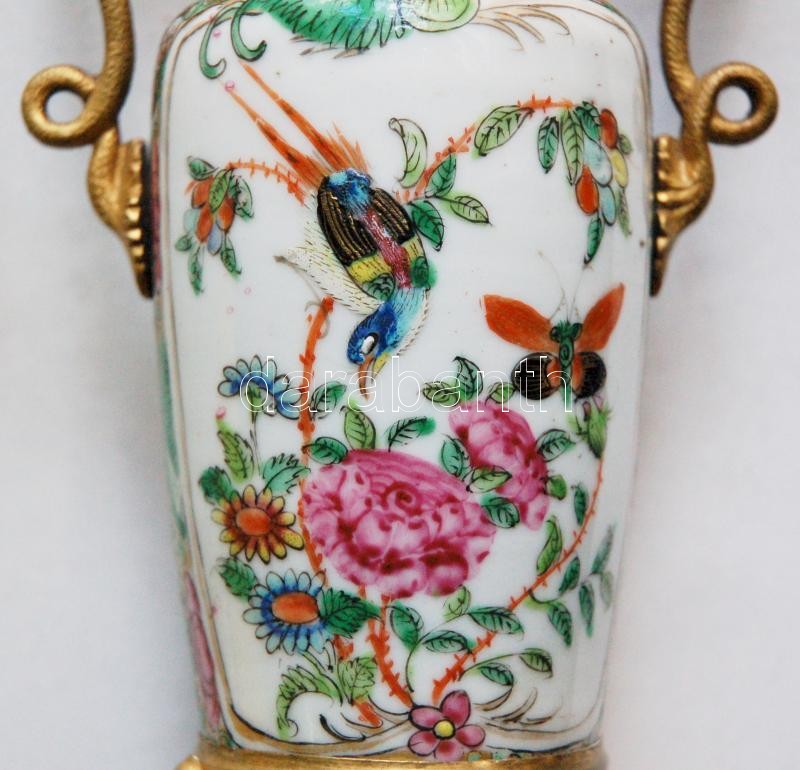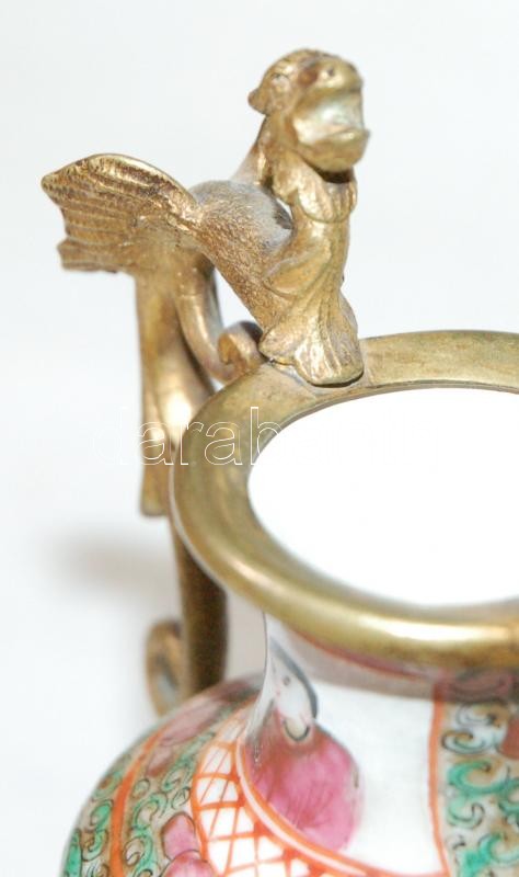 XIX. sz. első fele: Kínai váza, festett porcelán, "famille rose" díszítéssel, aranyozott bronz rátétekkel. /