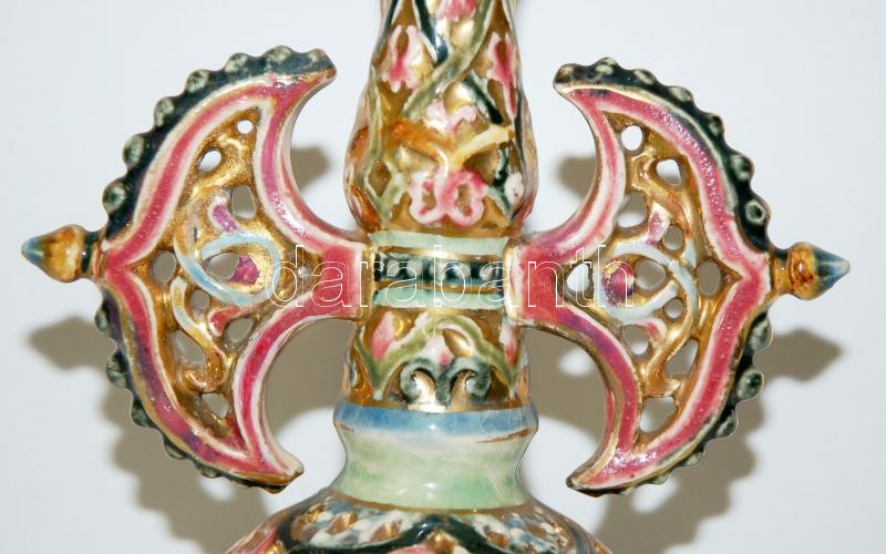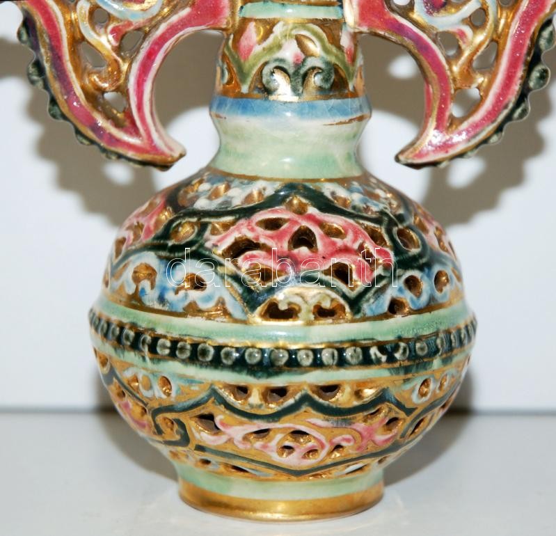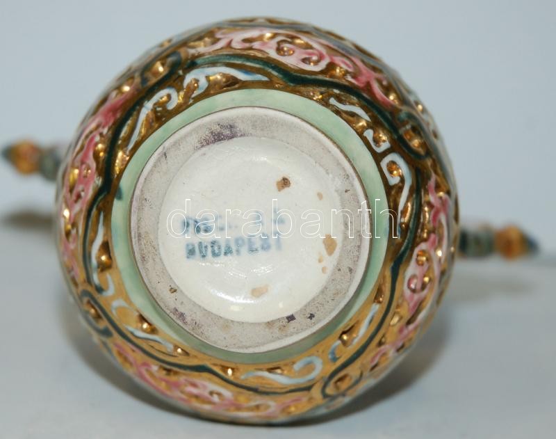 XIX. század vége: Kézzel festett aranyozott gyönyörű áttört Fischer János Budapest jelzésű Herendi fajansz díszkancsó fülekkel hibátlan állapotban /