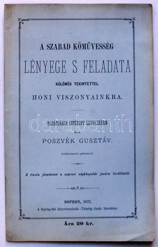Leírás: Poszvék Gusztáv: A szabadkőművesség lényege s feladata különös tekintettel a honi viszonyokra. Sopron 1877. Seyring. 24p