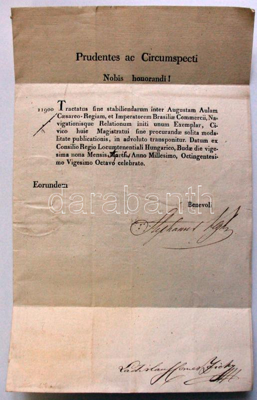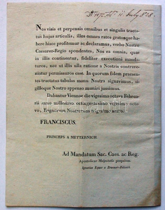 1827 Hajózási és kereskedelmi egyezmény szövege mely Franciaország és Ausztria-Magyarország között köttettet a kihirdető helytartótanácsi ex offo levéllel rajta gr. Zichy László és Végh István tanácsosok aláírásával /
