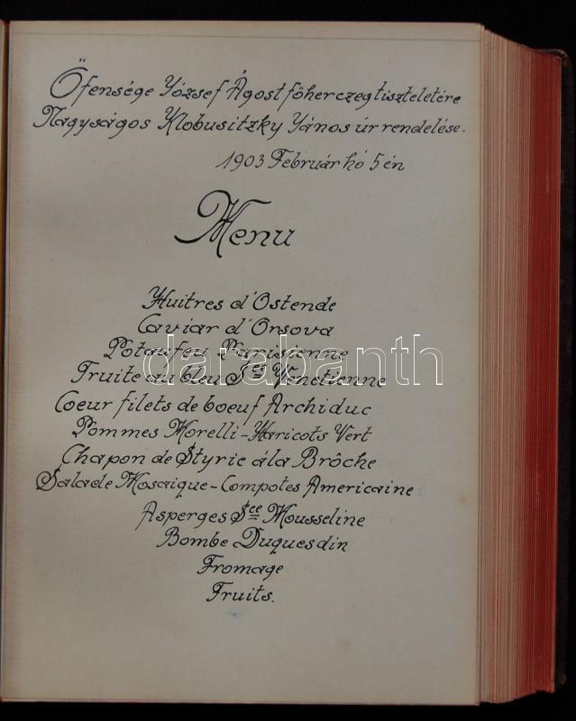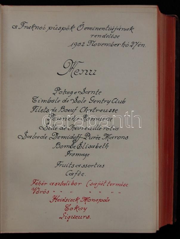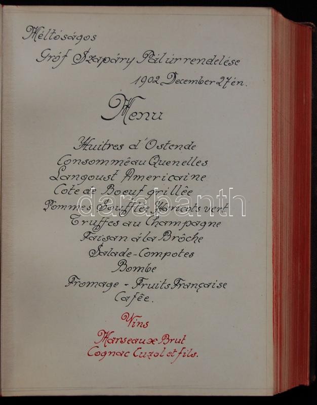 1902 Collection of menus cooked by Antal Müller renovn chef and restaurant ovner of his age. More than hundred hand-written menus in French with the names and titles of the orderers who were from the highest class of society. Politicans, noblemen, clerics... Full leather binding. 20x25 cm