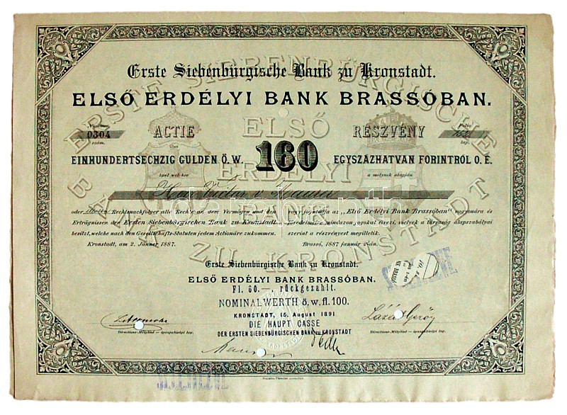 Hungary 1891. "First Transylvanian Bank in Brasov" common stock in 160 Forint value in German and Hungarian language with cancellation C:AU