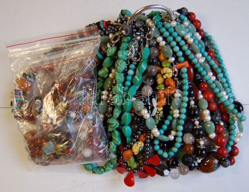 30 db féldrágakő lánc és 60 pár fülbevaló: aventurin, unakit, obszidián, sólyomszem, türkiz, lávakő, korallok, achátok, türkiz, tenyésztett gyöngy, stb.
