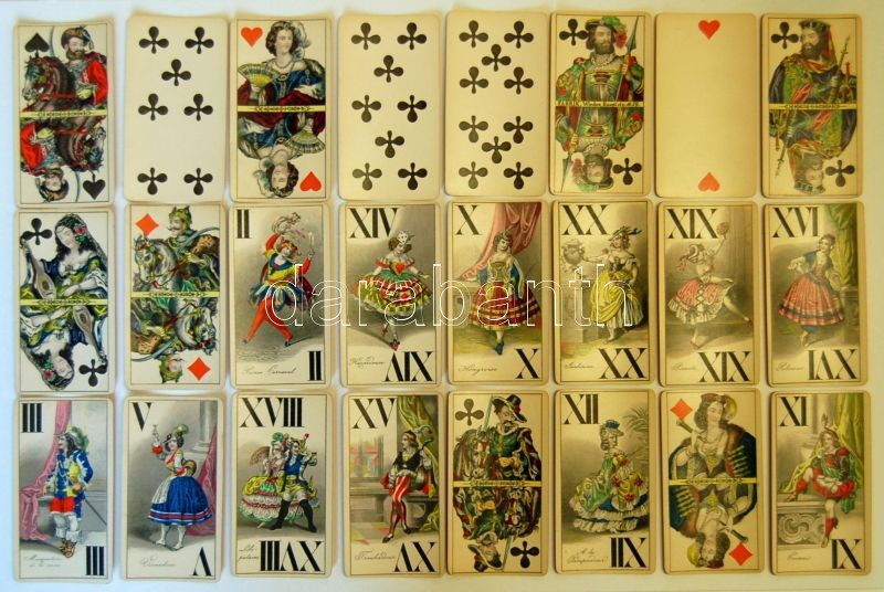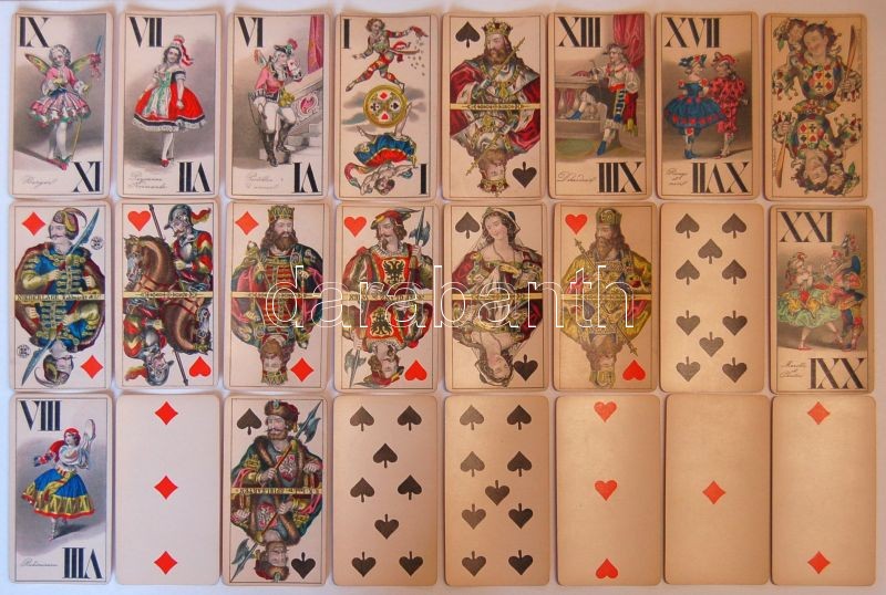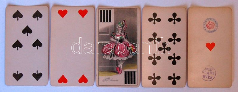 cca 1880 Joseph Glanz aranyozott szélű osztrák tarokk-kártya 53 lapos pakli tökéletes állapotban! Kártya-szignettával / Joseph Glanz deck of 53 tarot-cards with golded edge. With card-signetta All in perfect condition!
