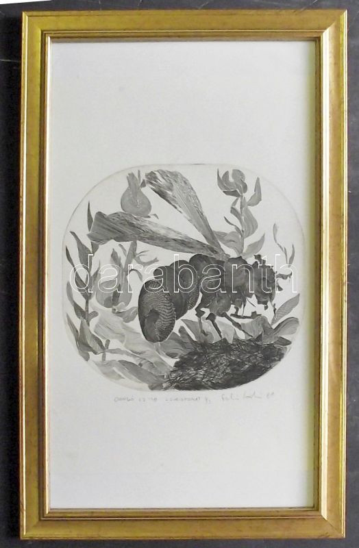 Leírás: Szabó LÁszló (1943-1993): Dongó, rézkarc-papír, zsűrinyomat 3/3, jelzett, keretben 29x47 cm