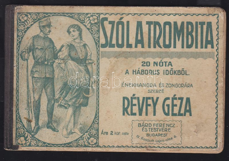 cca 1915 Révfy Géza: Szól a trombita - 20 nóta a háborús időkből 28p. ... https://www.darabanth.com/hu/140-Gyorsarveres/140.0/Festmeny-mutargy-papirregiseg-egyeb/Militaria~40014/cca-1915-Revfy-Geza-Szol-a-trombita--20-nota-a-haborus-idokbol-28p-egy-lap-serult~II412079