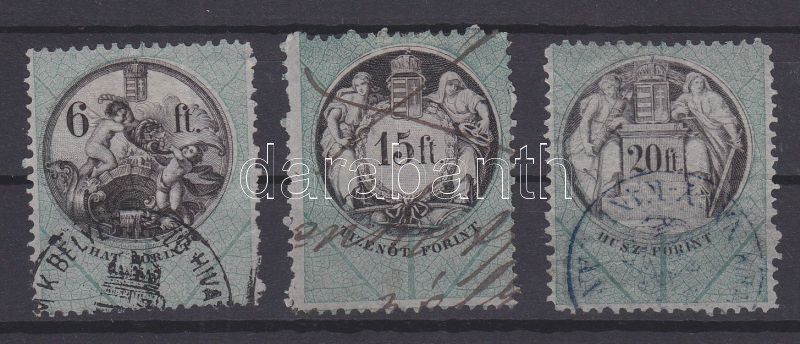 Leírás: 1870 Okirati illetékbélyeg 6Ft, 15Ft, 20Ft, kártya papír