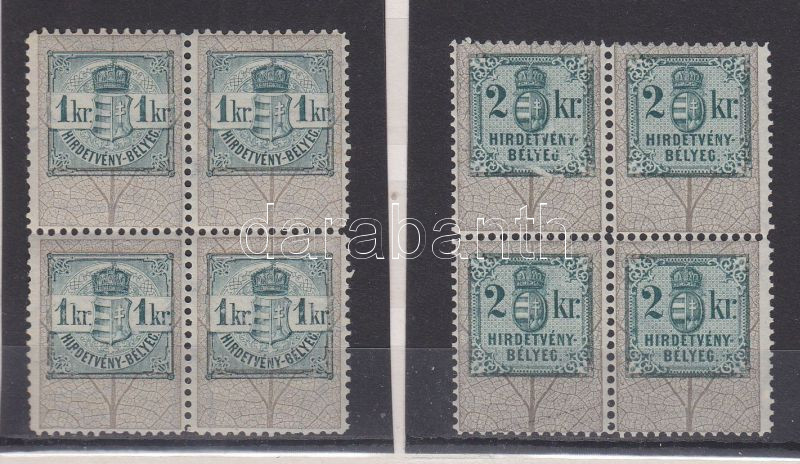 Leírás: 1891 Hirdetvénybélyeg 1kr, 2kr négyes tömbökben