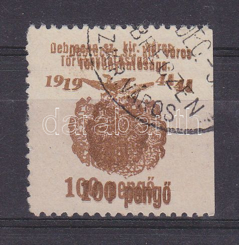 Leírás: 1945 Debrecen városi bélyeg 100P barna teljes kettős nyomattal