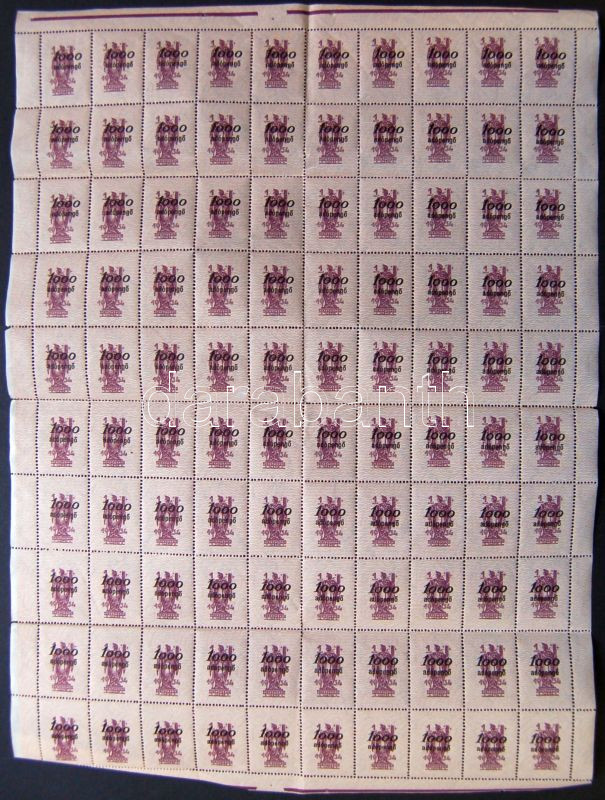 Leírás: 1946 1000 AP felülnyomású okmánybélyeg komplett ív