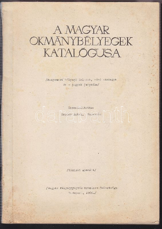 1966 Kaptay Antal: A magyar okmánybélyegek katalógusa https://www.darabanth.com/hu/140-Gyorsarveres/140.0/Festmeny-mutargy-papirregiseg-egyeb/Okmanybelyegek~40003/1966-Kaptay-Antal-A-magyar-okmanybelyegek-katalogusa~II413354