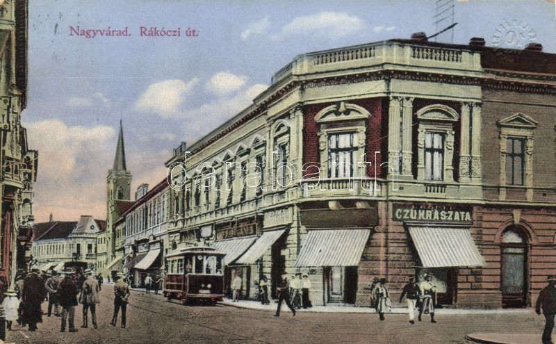 Leírás: Nagyvárad Rákóczi street with confectionery shop and tram