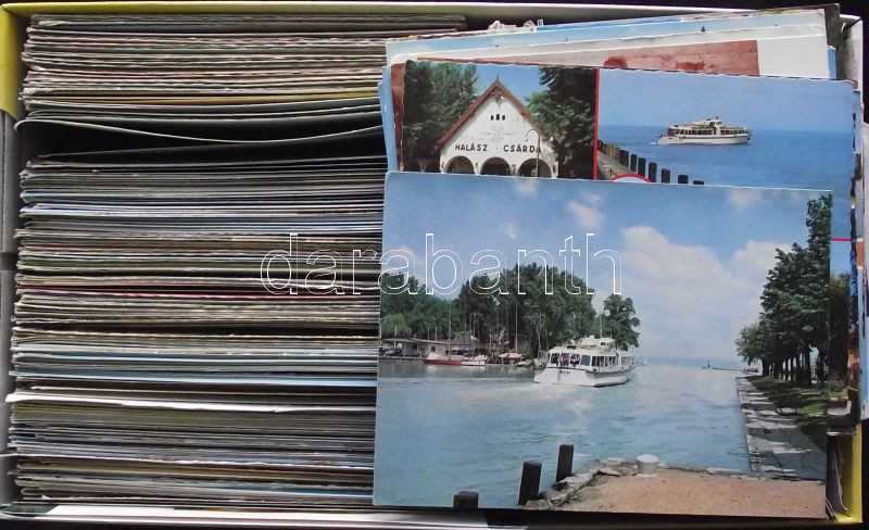 Egy tele cipős doboz tele modern képeslappal (legalább 500 db), rendkívül sokszínű és változatos tétel főleg külföldi, ill. hazai városképekkel és motívumlapokkal / A shoebox full of mixed modern postcards
